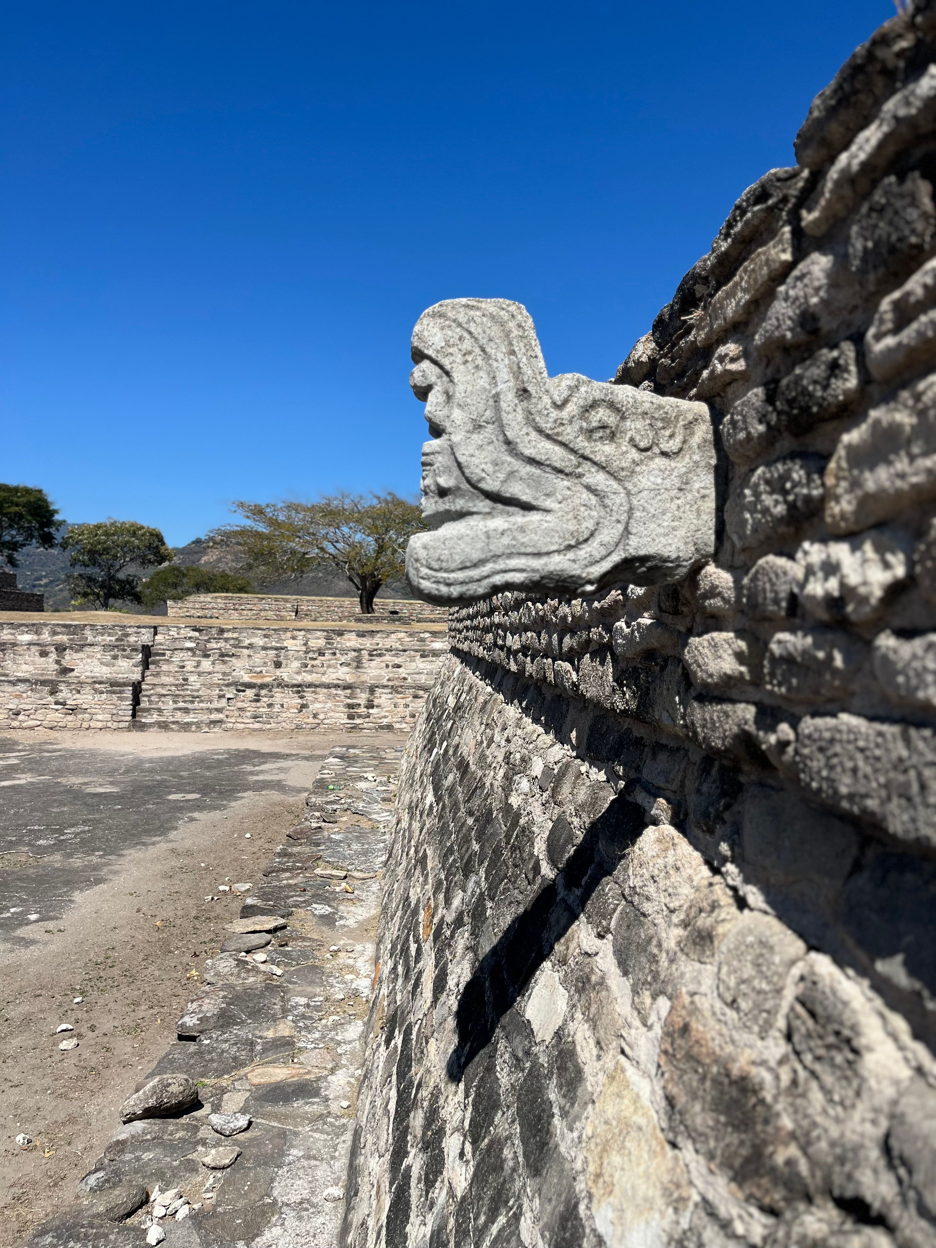We discoved the stone courts where a Maya ballgame called Pok-ta-Pok was played. It is a 3,500 year old ritual sport blended with a sacred, high-stakes ceremony. Players would use their knees, elbows and hips (no hands or feet) to keep a heavy rubber balls in motion while attempting to pass it through high stone rings. The court is surrounded by layers of rock walls where onlookers could watch. It is said that the game represented a battle, a cosmic battle, between day and night, good and evil. It was used to avoid war, settle disputes and often as a religious offering. The team who lost the battle, would often sacrifice their leader, though it is also said that it could also involve more mundane stakes such as the forfeiture of goods.